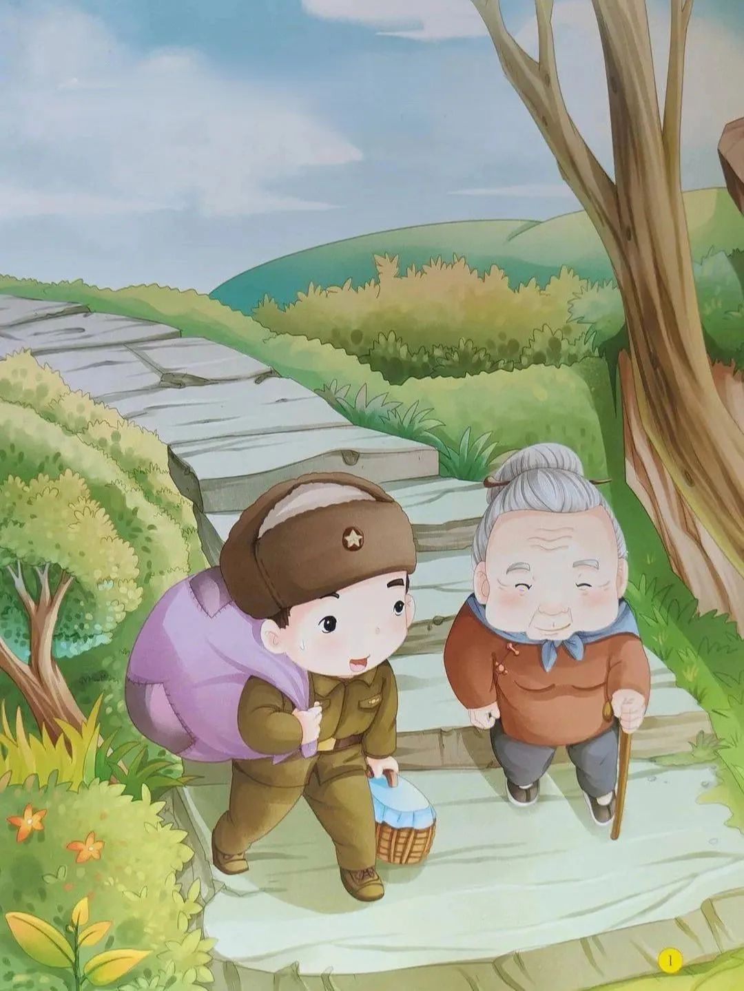 The path said he passed by yesterday, carrying an old woman through the thorns.小路说昨天他曾路过这里,背着年迈的大娘,踏着路上的荆棘。