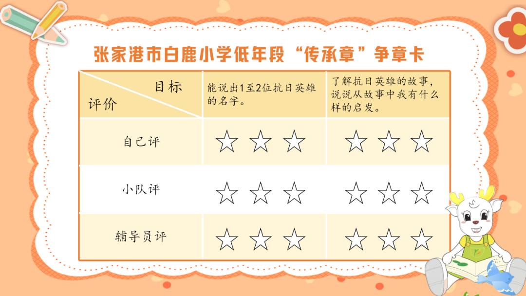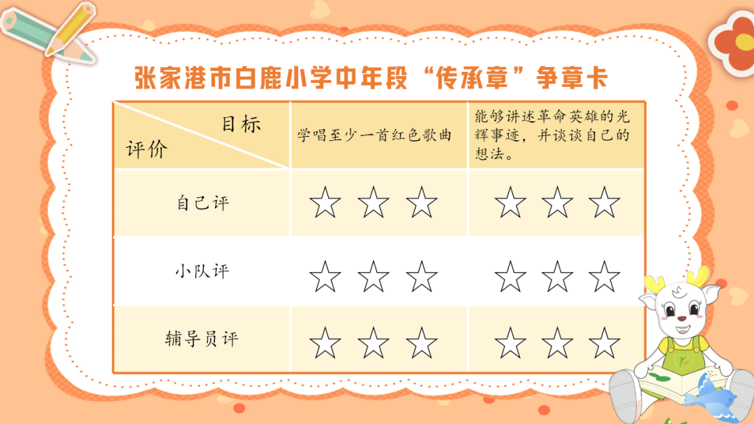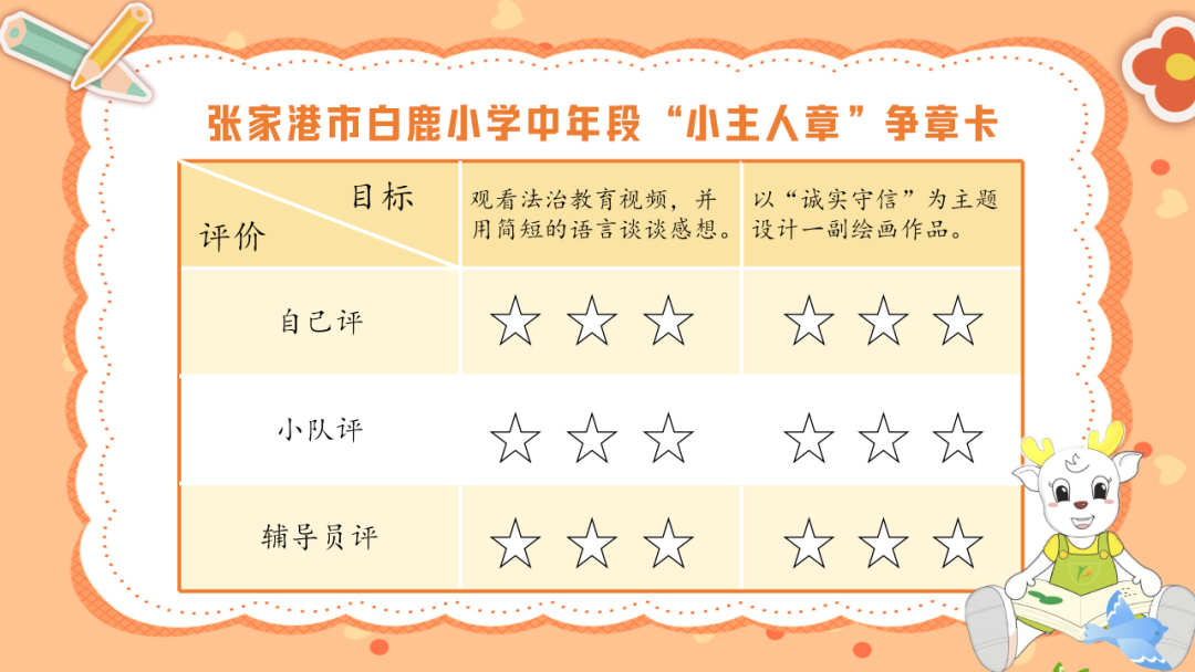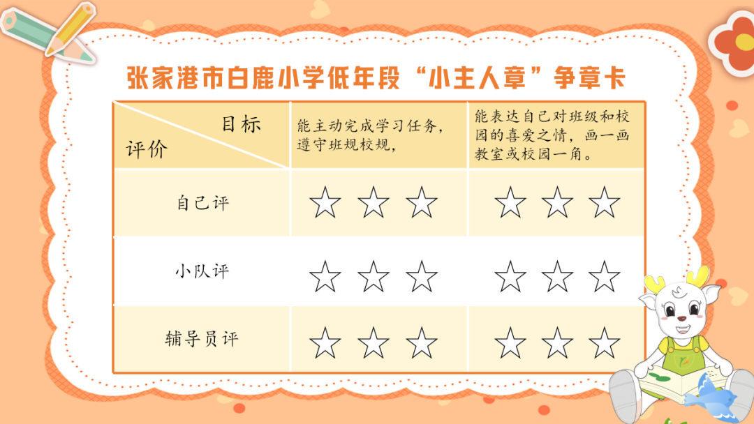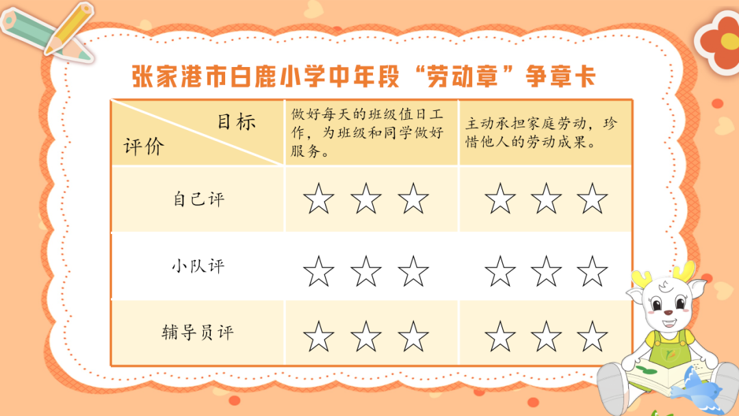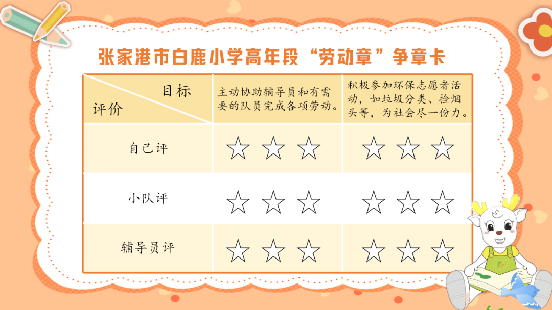 “特色章”争章活动大队部将联合德育处,继续围绕我校“鹿鹿榜样”活动开展,共设5个特色章,包括“用餐章”、“行走章”、“劳动章”、“交流章”、“学习章”,各中队队员每学期按月争章。
